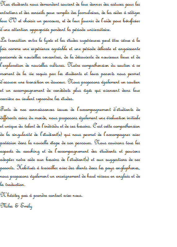 Nous avons également, au cours des quinze dernières années, accompagné des centaines d’élèves et étudiants français dans des classes et des cursus situés entre la fin de l’école primaire et le niveau doctorat / agrégation. Ces élèves étaient issus de plus d’une cinquantaine d’écoles, lycées et universités en France, dont beaucoup d’établissements de renom. La définition d’une approche sur mesure adaptée à l’élève et à sa situation a permis à un grand nombre de nos étudiants, au fil des semaines et des mois, d’obtenir de meilleurs résultats et appréciations de leurs professeurs, d’améliorer leurs méthodes de travail, et de développer un intérêt grandissant pour l’apprentissage. Cela a fortement contribué à leur rendre possible la poursuite d’un parcours académique et la construction d’une carrière professionnelle correspondant à leurs véritables aspirations.